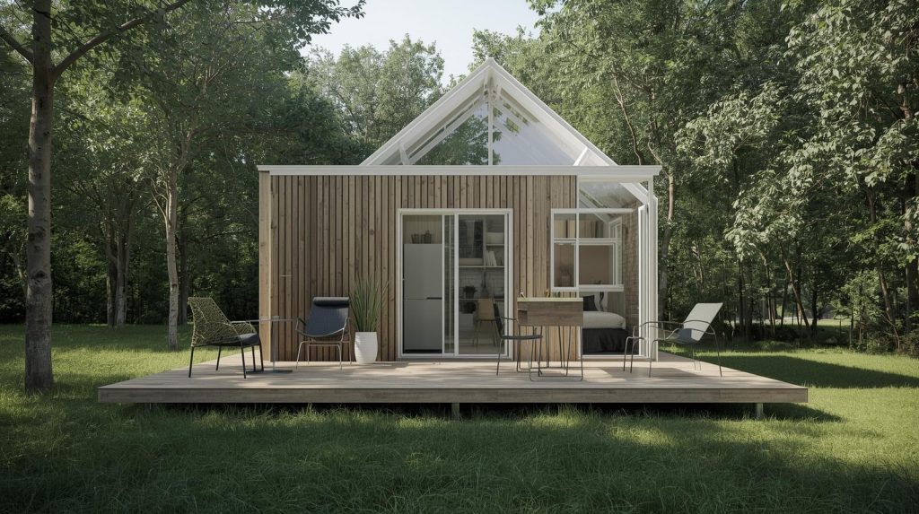 - Konsept: Minimal, ekonomik, doğa ile iç içe tatil evi.